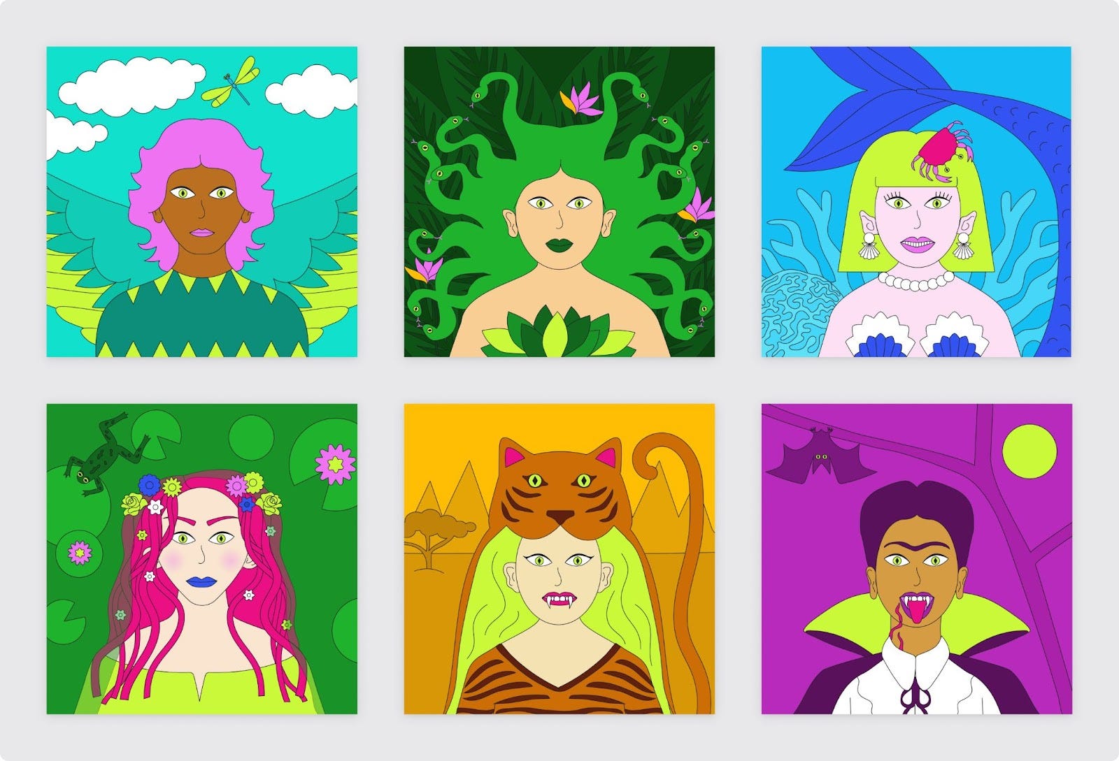 My friend Emma approached me to help illustrate a collection of NFT's for her startup Velvet. The end goal was to create a guide on how to mint and launch an NFT collection for under $600 as an educational post for those interested in the world of Web 3. I had a lot of fun creating these utilizing Velvet's electric yellow brand color and the prompt "smooth like Velvet." We landed on creating an NFT set of mystical femme fatales inspired by characters like medusa and ophelia and mythical creatures like mermaids and vampires.