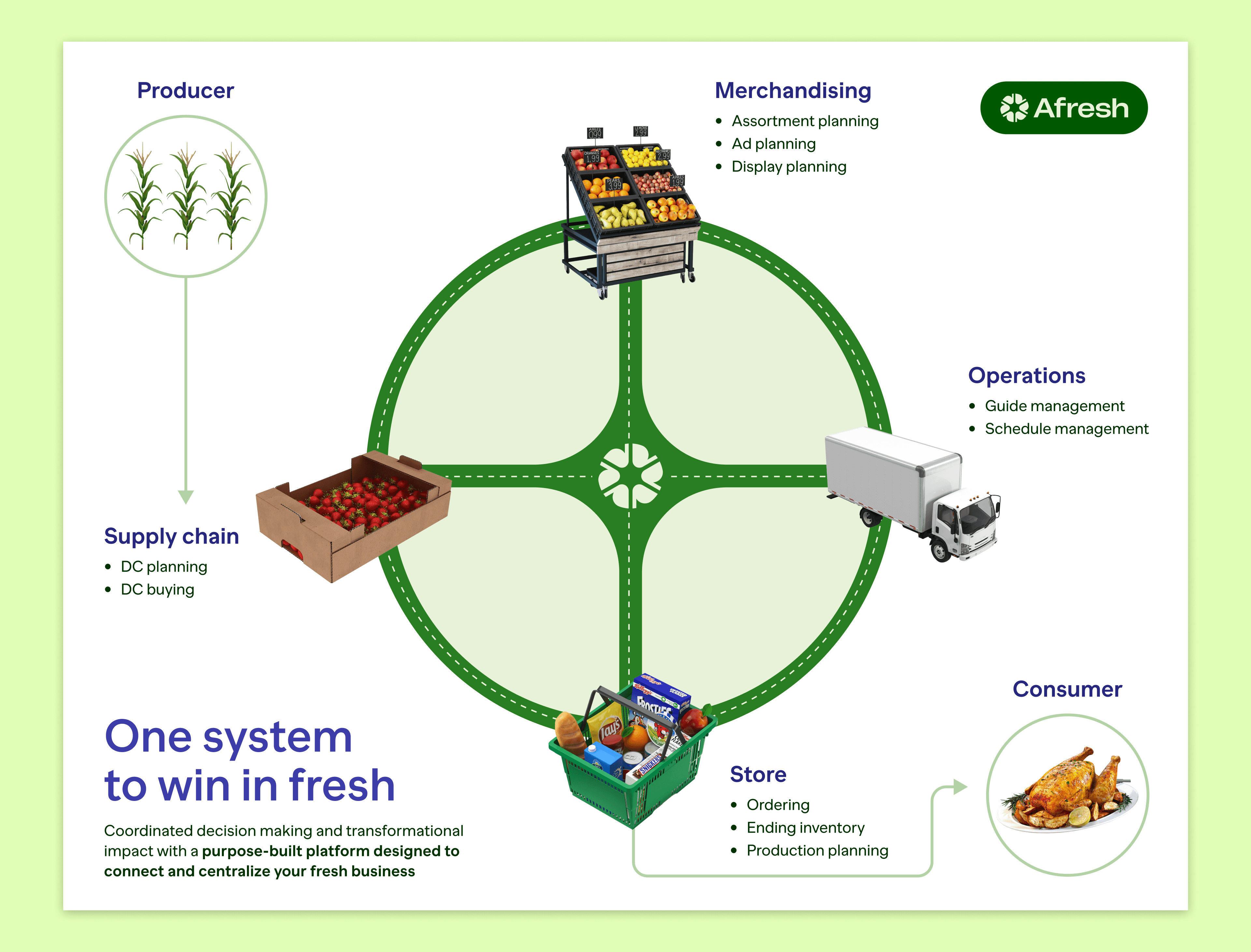 In 2022 we worked on refreshing the Afresh brand in order to differentiate us amongst competitors and stand out as a premium product. Working closely with the studio Upper Quad we implemented an exciting refresh that transformed every aspect of the brand. As the sole brand designer on the team, I extended the work across print, web, event, and product touch points.